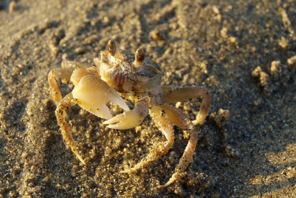 干潮のときに現れる砂浜はカニの王国。スナガニやコメツキガニが砂地の穴から這い出してくる。