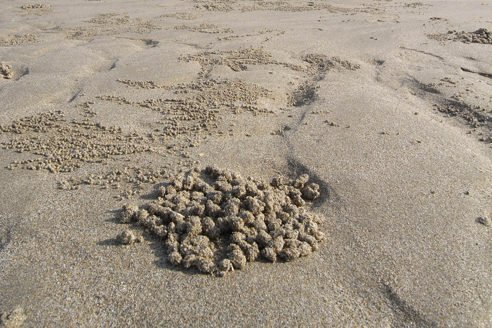 このときの彼らの仕事はおもに「砂喰い」だ。口周りの脚で砂を口に運び、砂から漉しとった有機物を消化器官へ。そして、砂のほうは吐き出しながら団子状にして、砂浜に並べていく。彼らの食事は、砂に過剰な有機物がたまるのを防いでいる。