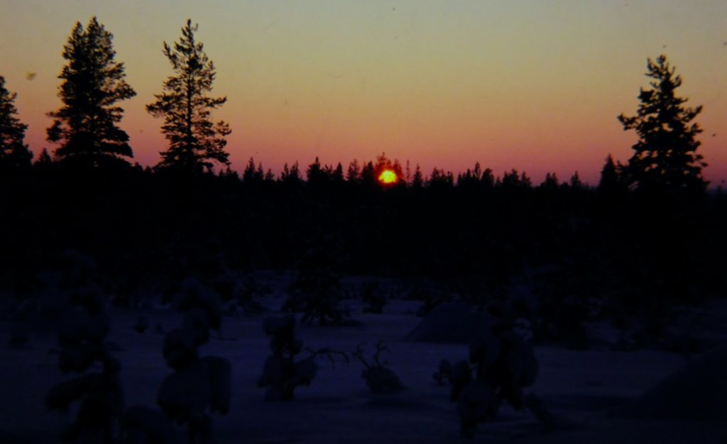 翌日、郊外の山の中へ雪景色の写真を撮りに行った。冬至に向かってますます昼間の時間は少なくなった。空がやや明るくなり茜色になる。やがて太陽が顔を出し、半分も出たところでまた沈んでしまう。そこからは夕焼けだ。その間1時間ほど。この明るいうちに写真を撮らなくてはならない。大忙しで雪の原を駆け回った。