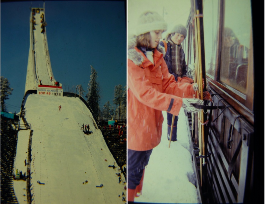 (左)ちょうどこのときはジャンプ競技が開催されていた。ジャンプというものを初めて実際に見てそのダイナミックさにびっくりした。このジャンプ台の下にはスキー博物館があり、古いスキーなどが展示されている。その後、ジャンプのスタート地点まで登ってみたが、ジャンプが犯罪の刑罰だという話も、あながち嘘とは言い切れないと思った。(右)地下鉄ホルメンコーレン線は都市部を抜け、すぐに地上を走ることになる。この当時の車両は車体の外側にスキーキャリアが付き、革ベルトで止める。