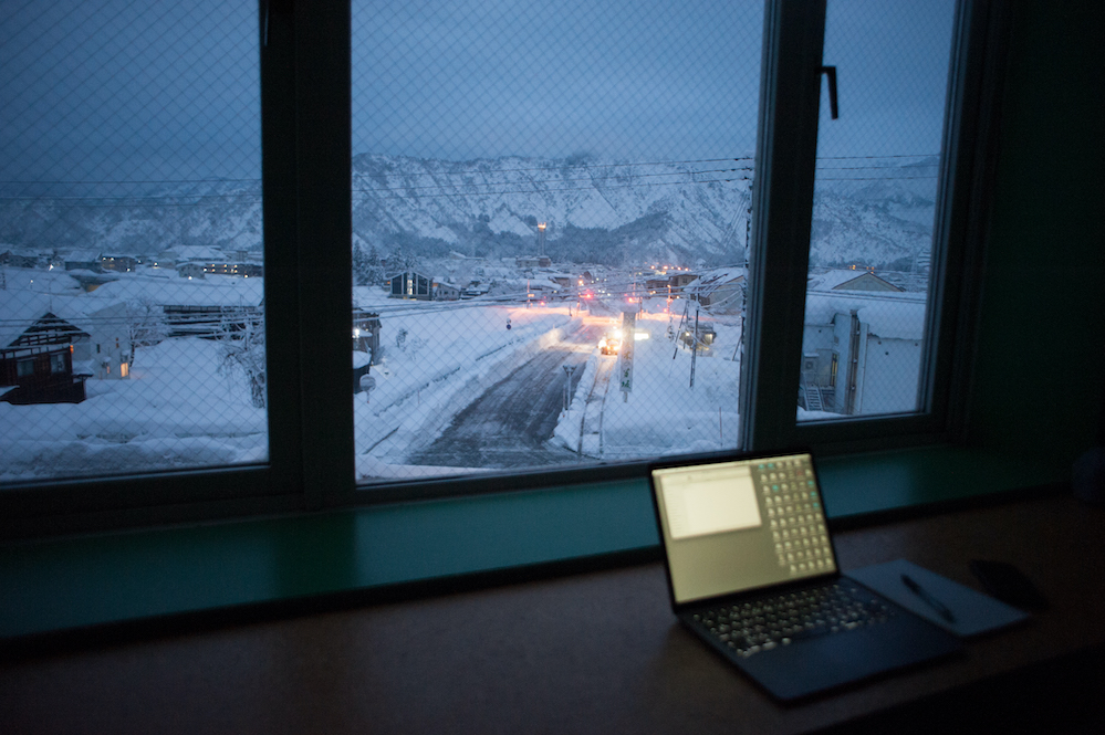 六日町にいる間、起床は毎日5時。その日の行く先は、実際に窓の外の様子を見てから決める。夜の間にどのくらい降って、どんな質の雪がどのくらい積もっているか。それらをきちんと自分の目で見てから、目指すべきフィールドを決める