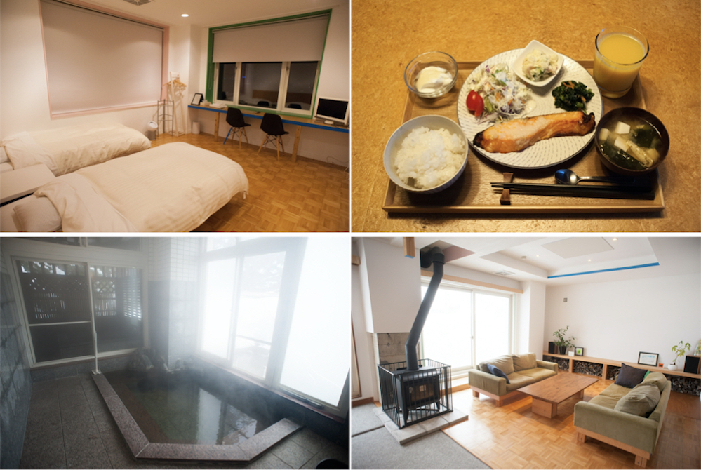 左上/清潔で整った部屋 右上/食事は朝食のみ。お米は地元のものを、土鍋で炊いて提供。米だけで、朝からワシワシいける 左下/源泉かけ流しの温泉付き。心地よい冷気を楽しむことができる外湯も 右下/落ち着いたインテリアのリビングスペース。もちろん高速インターネット回線完備