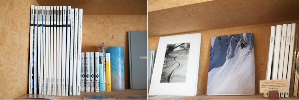 六日町ヒュッテの書架。滑ることが好きでどうしようもない、という気持ちが溢れている