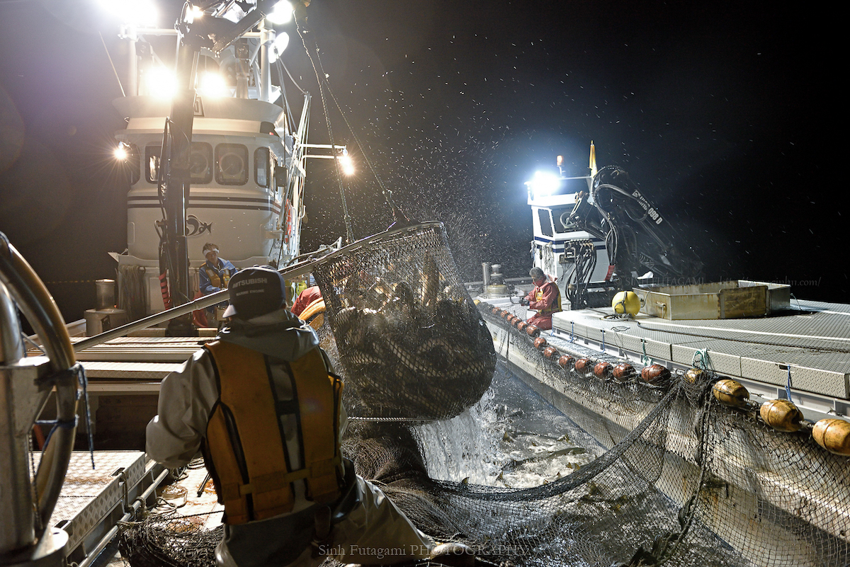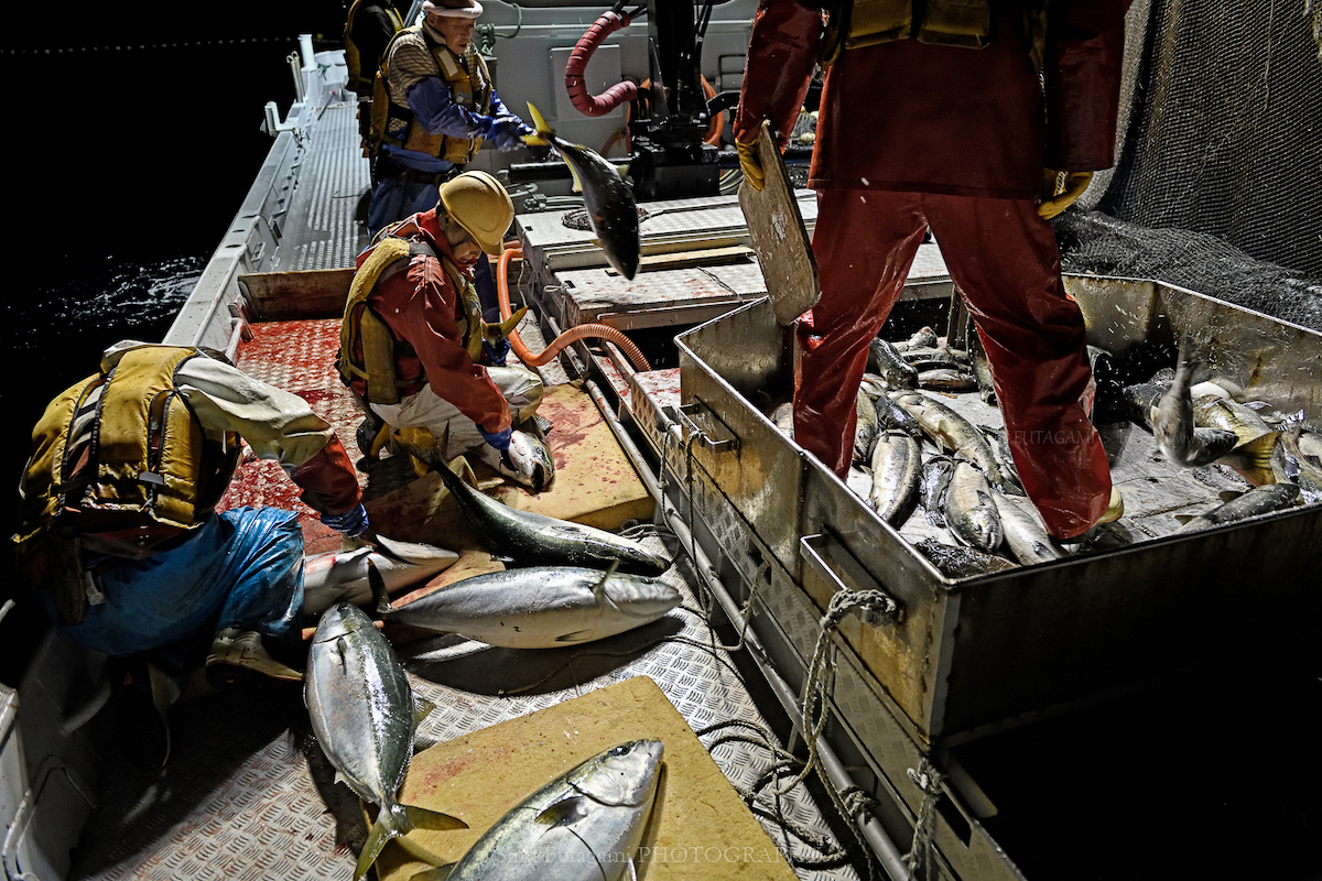 私のメインの被写体となっていたヒグマを追うなかで、さまざまな河川で遡上するシロザケの姿を目にしてきました。現在は、彼らの姿をより力強くとらえるべく水中撮影にトライしていますが、もうひとつ、ちがった視点で彼らを追い続けています。それは、知床半島、羅臼の定置網漁。漁船にお邪魔して、彼らの漁の風景を撮影しながら、網の中に入る鮭の変遷を見てきました。