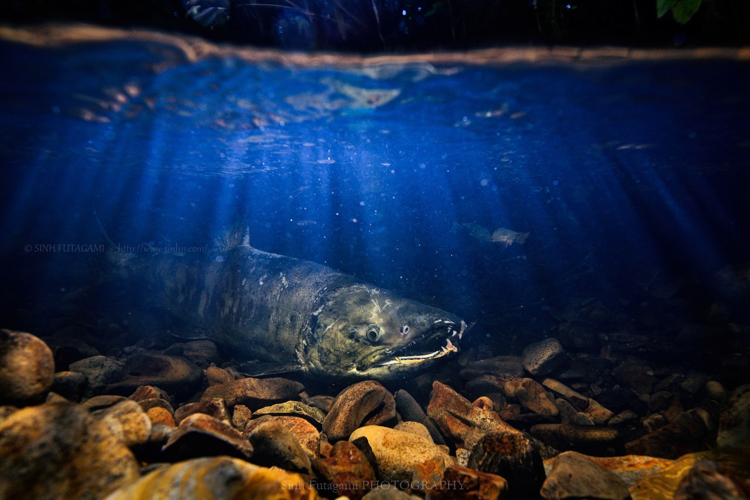 自然写真の本格的な撮影をはじめて9年ほどになります。とくにクマの食性を探りながらフィールドを歩いていくなかで、どんなものにも豊凶がある、と感じるようになりました。ドングリやヤマブドウなど、秋の実りはもちろんですが、同様に鮭の遡上量にも豊かな年と、寂しい年があります。水中の撮影はまだはじめて間がありませんが、陸上からも彼らの姿は撮影できます。遡上量が多い年には、とくに注力して鮭の撮影をしてきました。
