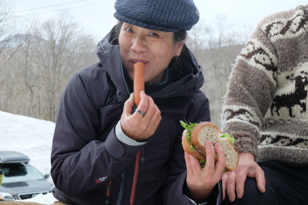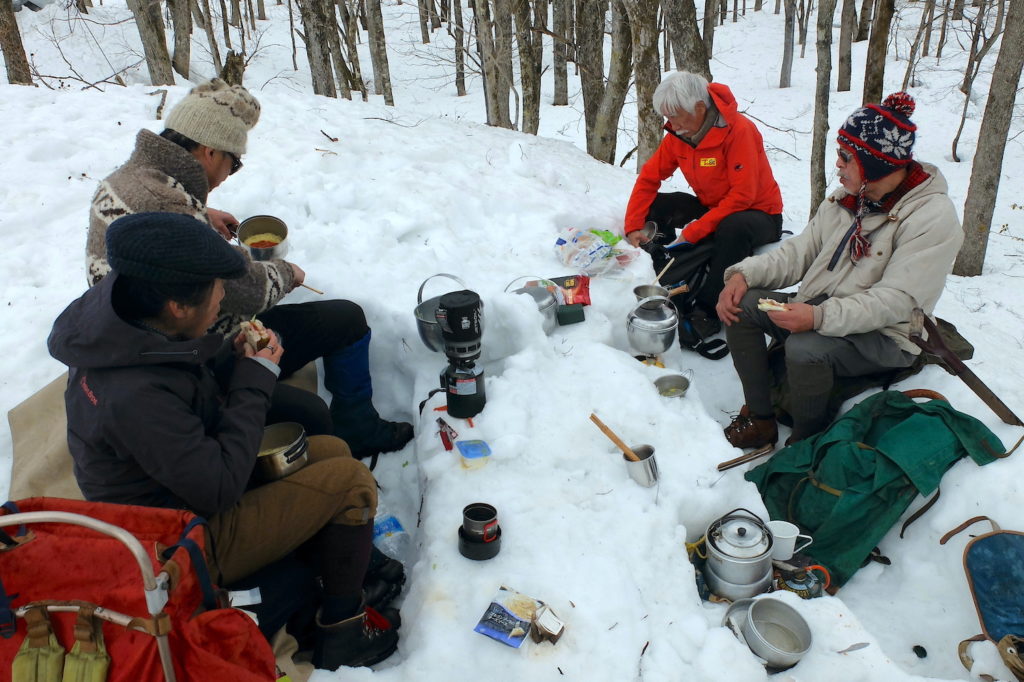スタート地点に戻り、除雪でできた雪の山の上にそれぞれのレストランを開いた。ここは林の中で、さっきまでの強い風は嘘のように静かだ。遠くには川の流れも見え申し分ない。山本由紀男はおもむろにコーヒーグラインダーを取り出し豆を挽き始めた。そうだ、彼はコーヒーにはうるさく、スキー同様一家言持った男。