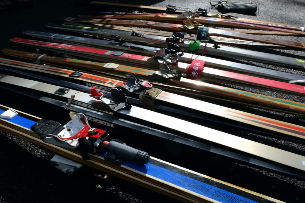 みんなが持ち寄ったスキーを並べてみた。テレマーク専用のものからXC専用。懐かしいスキーが勢揃いした。最近の幅広のスキーとかカービングは1本もない。