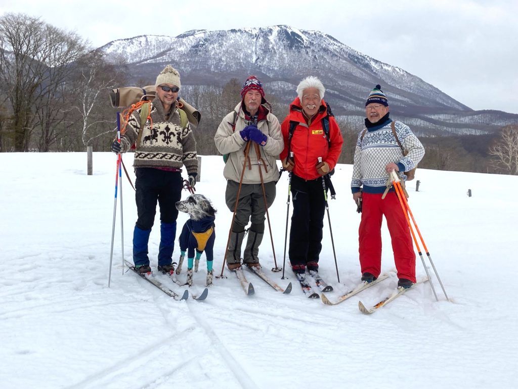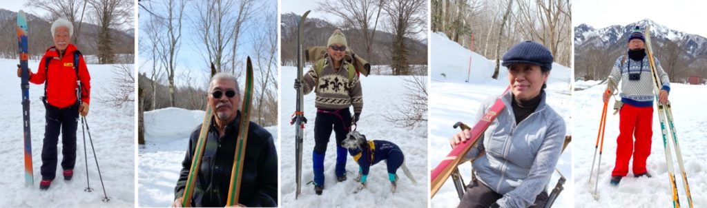 左から山本由紀男、テレマークスキー黎明期からヒールフリーを普及のため尽力したパイオニア。 TAJ初代会長。今、2軒目の家を制作中。左から2番目 カツヤ・ナントウ、この人をひと言で説明するのは困難。わかっているのはスキー、フライフィッシング 、クライミング、カヤック、料理、ブルーグラスの技術を持ち、なお且つそれらの道具を決して捨てずに持ち続けている男。中央、吉田二郎。この男もなかなか説明が難しい。確実にわかっているのは、有名アウトドアメーカーに勤めている僕の友人と大学の同窓生ということ。今回はカウチンセーター、カザマハイカントリーで参加してくれた。足元には保護犬セッターのジョーが。左から4番目は吉田潤子、二郎令夫人。溺愛家のタイトルはこちらの方がふさわしいと思う。ジョーのお世話役。現役時代に使っていたRexのウッドスキーを見つけ大喜び。さてどん尻は旗振りユーさん。古いXCスキーのものをと考えたら、この数十年間スキー関連のものはまったく買っていない事に気づいた。つまりどれを持っていってもオールドスタイルになるわけだ。セーターはノルディックセーター、お揃いの帽子はきつく、スウィックスのニットキャップ。ズボンは残念ながらツイードのニッカーはすでになく、パタゴニアのパンツ。スキーはお気に入りのモロト、靴はアゾロNNNーBC。