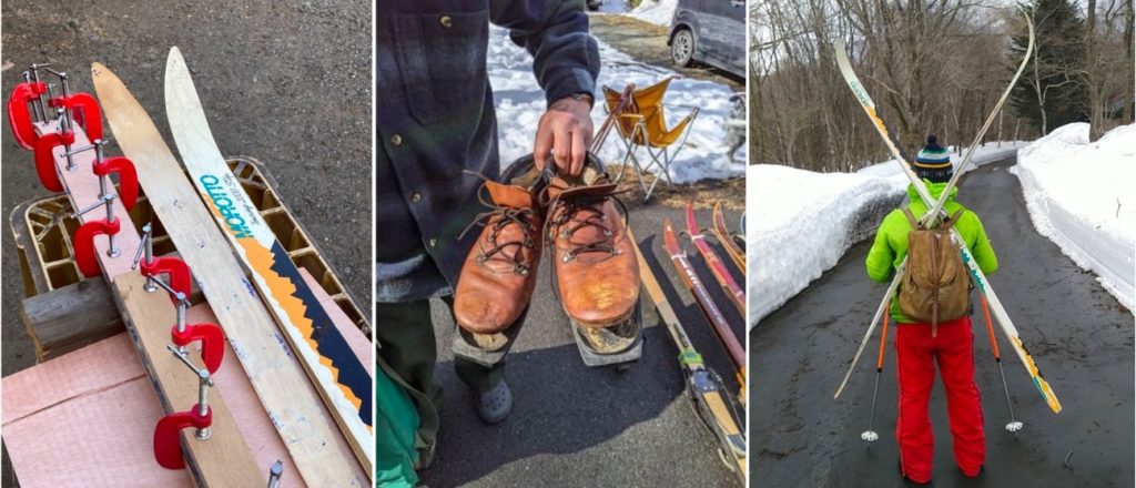 (左)何年も使っていなかったXCスキーの滑走面が剥がれてしまった。完全にである、それも2本とも。このスキー、中央部だけにスチールエッヂが埋め込まれたステップソールの軽いスキー。このタイプのものがなかなかない。仕方がなく接着剤を調べて修理を試みた。とりあえず今回のツアーでは問題なく使えた。(中)ソールががっぱりと剥がれたカツヤ・ナントウのブーツ。これも彼は修理すると張り切っていた。来年このブーツが再登場するか? (右)ツアーを早く切り上げアスファルトの道を歩くしかなかった。僕のブーツも取り返しのつかないことになってしまった。むかし山へ滑りに行ったときのように、ザックと背中の隙間にスキーをクロスに刺した。カツヤ・ナントウはそれを見て、「ユーさん、懐かしいことするね」と言ってシャッターを切った。