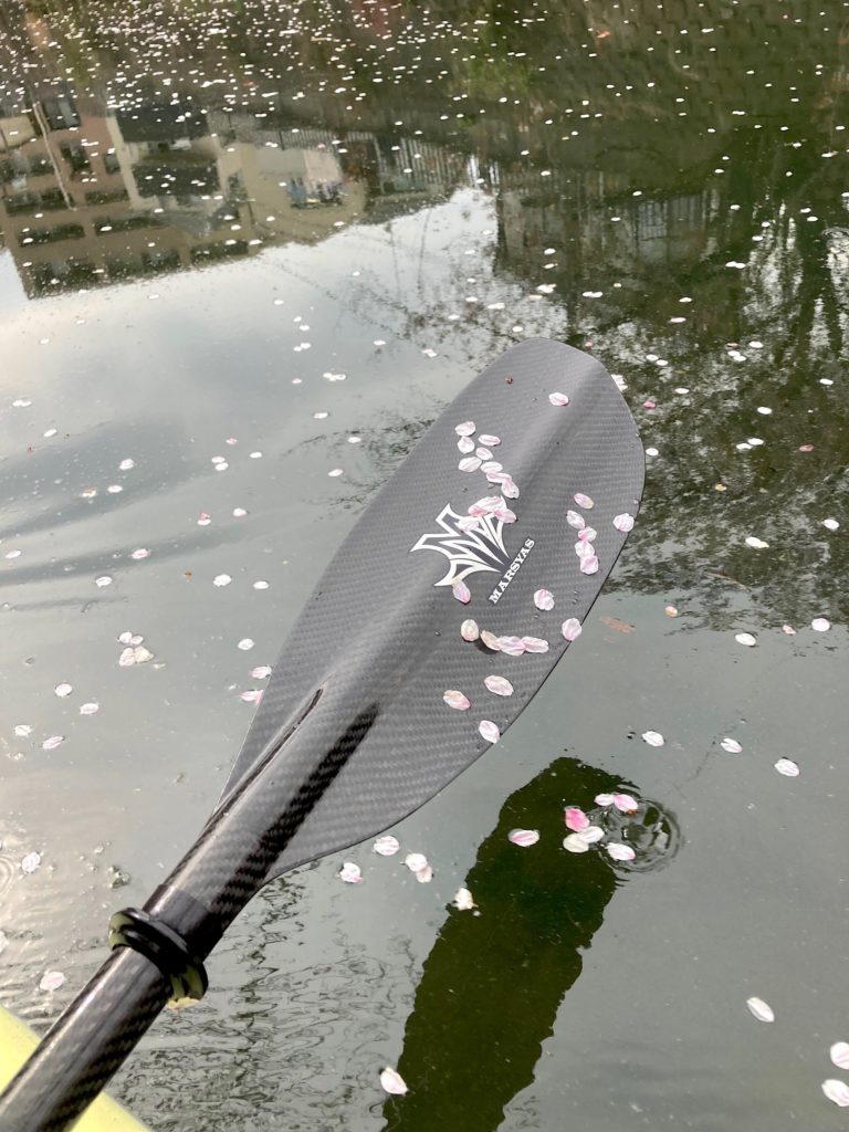 花びらが落ち花筏となったピンクの流れを探し、それを切り裂くように漕ぎ上がった。後ろを振り返って見ることができないが、きっとカヤックの引き波で翻弄され、たくさんの花びらが渦をつくっているだろう、などと想像しながらパドリングを楽しんだ。