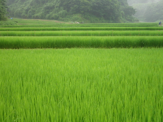 毎月1回のペースで田んぼの周りの草刈りをする。植えた苗は活着し、元気に伸び青々としてくる。こうなれば畝が曲がっていたのも見えなくなる。そのかわり、稲の高さの凸凹ができてくる。これは肥料の撒き方が均一ではなかったためだ。よく見ると緑の色の濃さの違いもある。もう後の祭りである。手直しは効かない。後になってわかることだが、収量にそれほど関係がないので心配することはなかった。