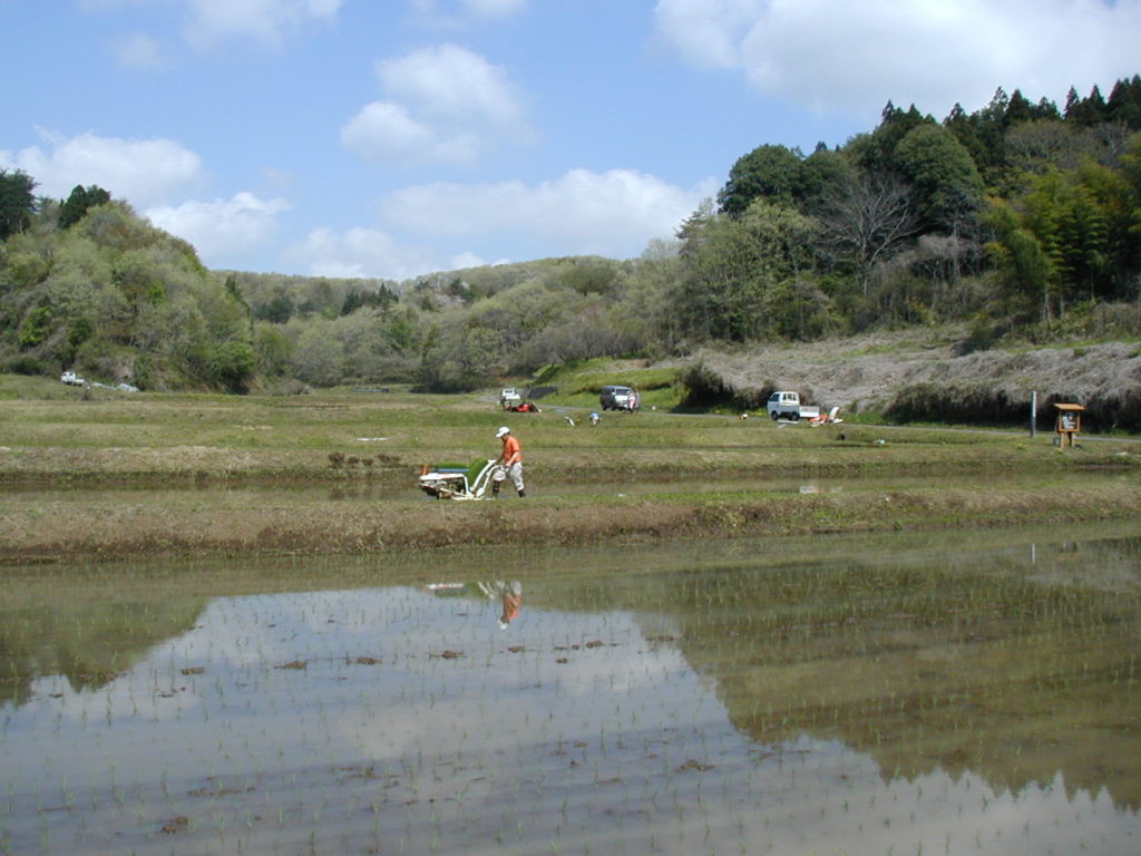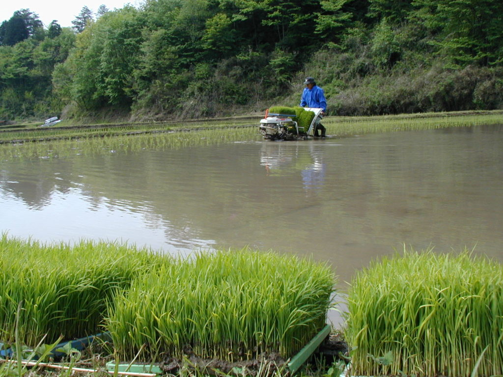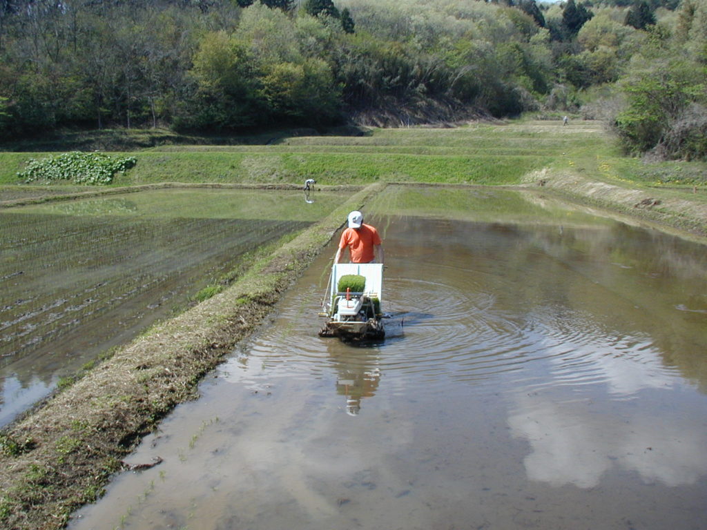 稲の苗は水稲用育苗箱で育てられる。農協から買ってきた苗は田植えの日まで田んぼの端に浸けておく。当日水を切り、しっかりと根の張ったマット状の苗を機械にセットする。田植え機はこれを端から3、4本ずつ土に植えていく。機械の進み具合が遅くなると株間は狭くなり、早くなると広くなる。これを調節しながら、なるべくまっすぐに植える。これがむずかしい。