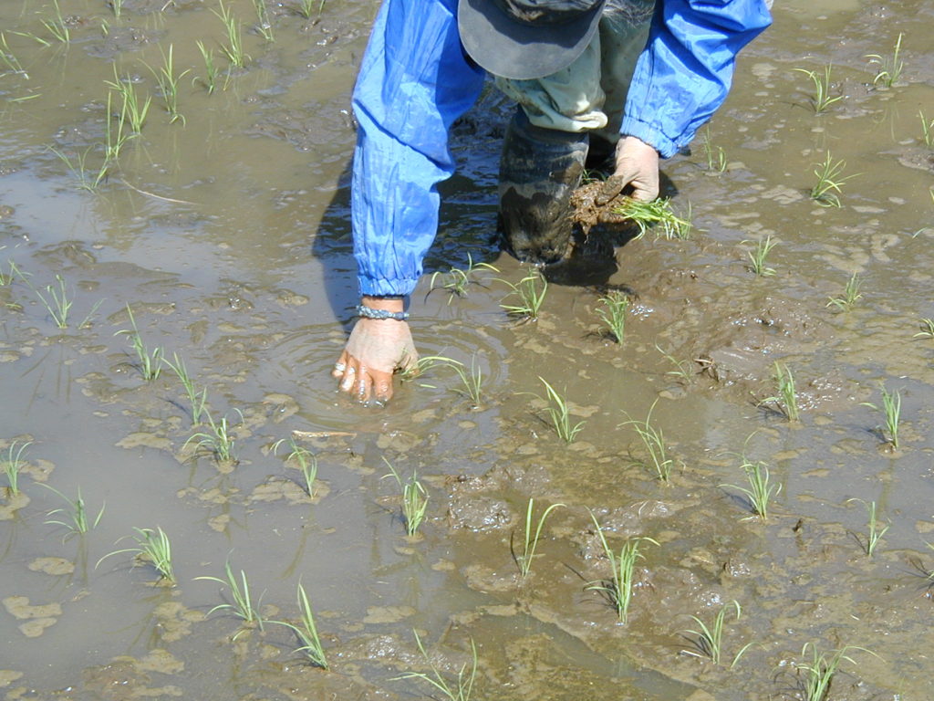 機械で植えた後、手直しが始まる。機械で植えたままだと植え損じが案外ある。水が多いと苗が浮いてしまっているところもあり、それらを手で植え直す。これがなかなか辛い。1人5条の列を点検しながら何度も田んぼの中を往復する。ちょっとした手間だが、それがお茶碗1杯分になるかもしれない。