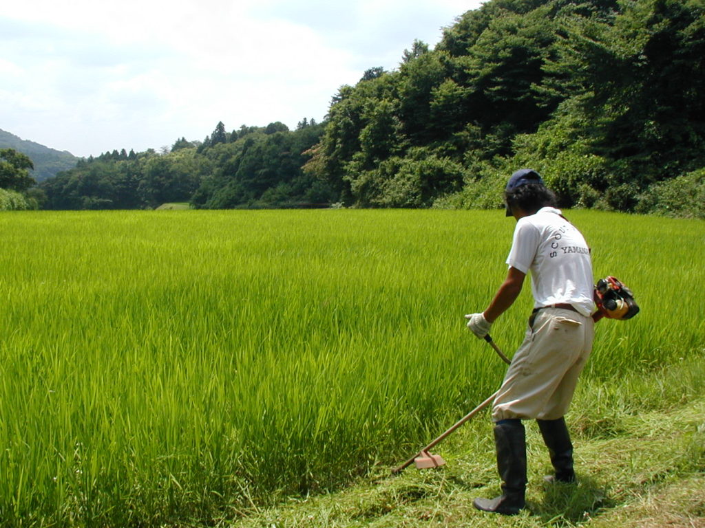 田植えの後は月1回程度、田んぼの周りの草刈りは欠かせない。夏は暑いので7時頃から作業に入り10時に終了。川へ行ってパンツ1枚で水浴びをし、お昼を食べ、昼寝をして3時に作業を再開し、5時には終わる。集落の共同管理の土地、道路脇、水路に溜まったゴミ掃除と、百姓の仕事は終わりがない。