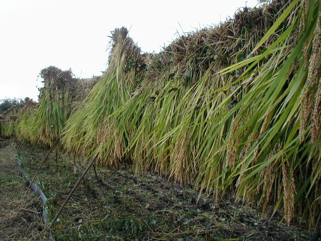 はさ掛けをして稲を乾燥させる。束ねた稲をここまで運ぶのも田んぼがぬめっているとこれも大変な作業だ。稲穂を下に向けて掛け、水が染み込まないように稲の切り口をビニールで覆う。こうしておくと稲の茎の部分にまだ残っている栄養分が米に溜まり、登熟するという。みなそう言うが本当のところはよくわからない、と僕は思う。