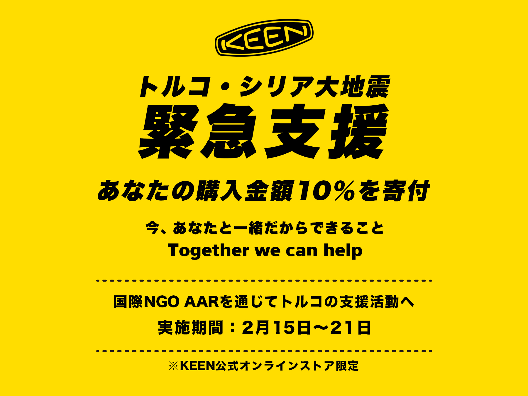 日本のみならず、国内外の災害に対して素早いアクションを起こしてくれるのがkeenだ。今回のトルコ・シリア大地震に対しては、購入金額の10パーセントを、トルコで支援活動を展開している国際NGOに寄付することが発表された。