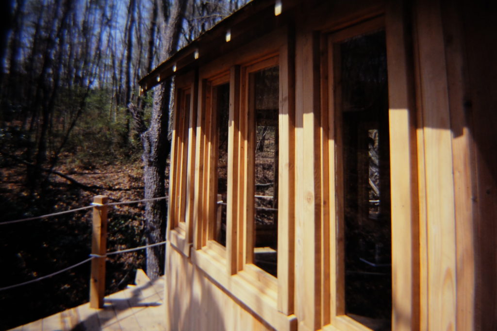 同じ薪炭林につくられたピーターのツリーハウス。僕のツリーハウスの木よりも細い木ばかりで、1本の木につくることはできなかった。何本かの木を抱え込みプラットホームをつくった。その中心にキャビン、周りは歩けるほど余裕があった。手すりの代わりにロープを張り、プラットホームへのアクセスの階段の手すりもロープを付けた。彼らは電動工具をアメリカから持ち込み、2x4工法で施工した。ただし、窓枠やドアはすべて自作したのでそれにやや時間はかかったが、意外に短時間でできあがった。