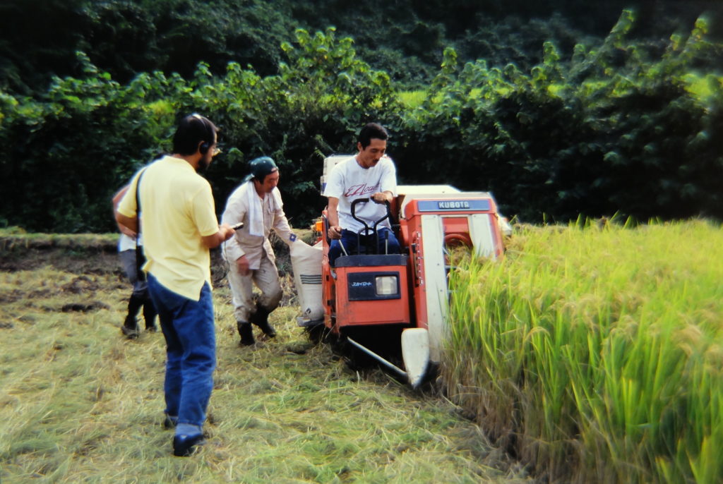稲刈りの取材にきた菅原正志さん。米作りの楽しさ、大変さをより正確に伝えるため、みずからコンバインに乗り収穫作業を体験。それらをテープに記録し、放送した、とは表向き。男なら誰しもこんな機械の操縦はしてみたいものだ。とくに菅原さんは何にでも興味津々のレポーター、やってみなくちゃはじまらない。