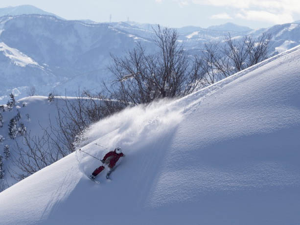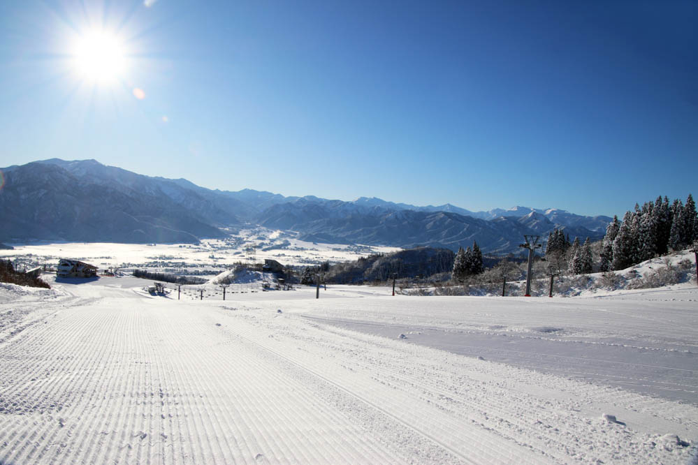 仕事の前の一本が一本で終わらなかった。なにしろ夜の間に50㎝近くも雪が降り、ゲレンデコンディションは一晩で完成。しかも圧雪はびっちり整っている。おまけに、眩しいほどの青空なのだ。こんなコンディションを逃さないのが、移動ゼロワーケーションの強みだ。朝イチのリフトに乗り込めば、背後には南魚沼の平野がどんと広がり、その向こうには雪をかぶった八海山や巻機山がそびえる。リフトの上から見渡す風景には独特の立体感がうまれ、いつも以上に景色に奥行きを感じる。