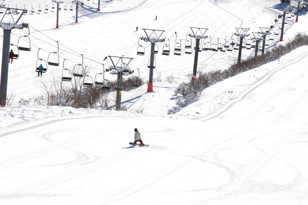 ムイカスノーリゾートといえば、このスーパーワイドな斜面。斜度が緩やかなのでビギナーにもやさしく、上級者は深いカーヴィングでスロースピードのシビアなバランス感を楽しむことができる
