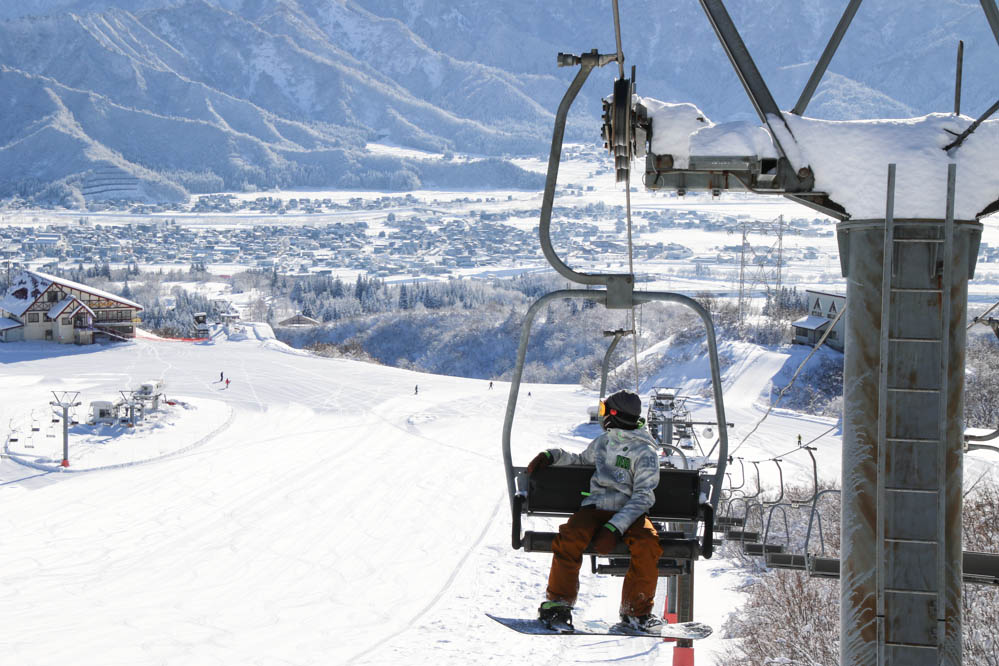 リフトの後ろに広がるのは六日町の市街地。ゲレンデと街とが本当に近い。滑ることと生活とが、密接に関連しているのだ