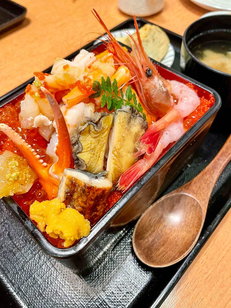 南魚沼市内の飲食店では、極上コシヒカリの旨さをさらに引き立てるべく、店舗独自の丼を創作。本気で作っているから「本気丼(マジどん)」。写真は尾道熟成赤酢を使った特性赤シャリにいくら、とびっこ、海老、かに、蒸し鮑などを乗せたLittle 北海道の「KURENAI 海老ざんまい重(2,880円税込)」