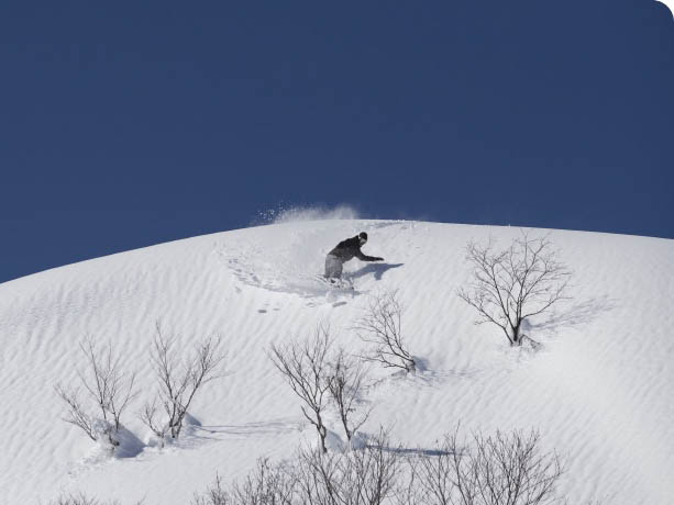 嬉しいのはゲレンデを運営する人たちが雪の遊びをわかっていること。圧雪はつなぎ目がほとんどないスムースさを誇り、ちょっとしたパークやウェーブなどの遊びが整い、斜度20度をこえる斜度があるかと思えば、ハイクアップでアクセスするオフピステフィールドが用意され、申請をすれば管理区域外も滑走可能なのだ。