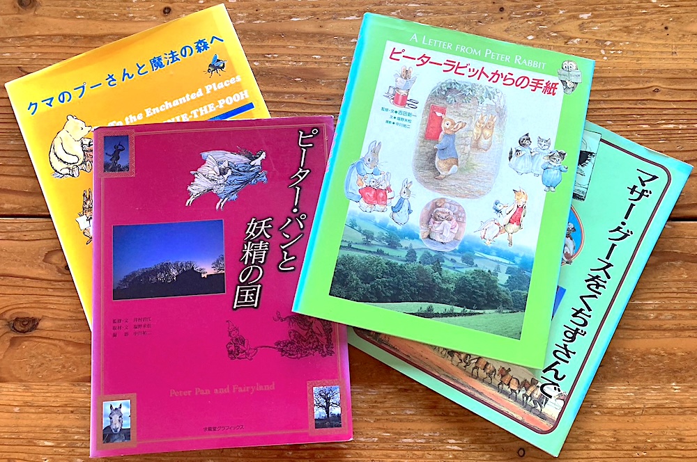(*10)『ピーター・パン』=イギリスの作家、ジェームス・マシュー・バリーによる『ピーター・パン;大人にならない少年(Peter Pan;or,the Boy Who Wouldn’t Grow Up)/1904年刊』および『ピーターとウェンディ(Peter and Wendy)/1911年刊』で描かれた空想上のキャラクター。空を飛ぶことのできるピーター・パンがネバーランドで冒険をするストーリーは、ご存じのとおり。(*11)『クマのプーさん』=イギリスの作家、A・A・ミルンによって書かれた児童小説。原題は『Winnie-the-Pooh/1926年刊』。ハチミツが大好きなクマのプーさん、ロバのイーヨー、ピグレットにティガーなどたくさんの仲間たちがクリストファー・ロビンと過ごす森の日常を描く。(*12)『マザー・グース』=“Mother Goose”。本来は、イギリスで古来から伝わってきた童謡の総称とされる。「マザーグースの歌」とも。長い歴史のなかでさまざまな童謡、歌謡が歌い継がれ、イギリスのみならず、アメリカなどから世界中へと広がった。童謡だけでなく、実在の人物や物語としても伝承されていることが多い。