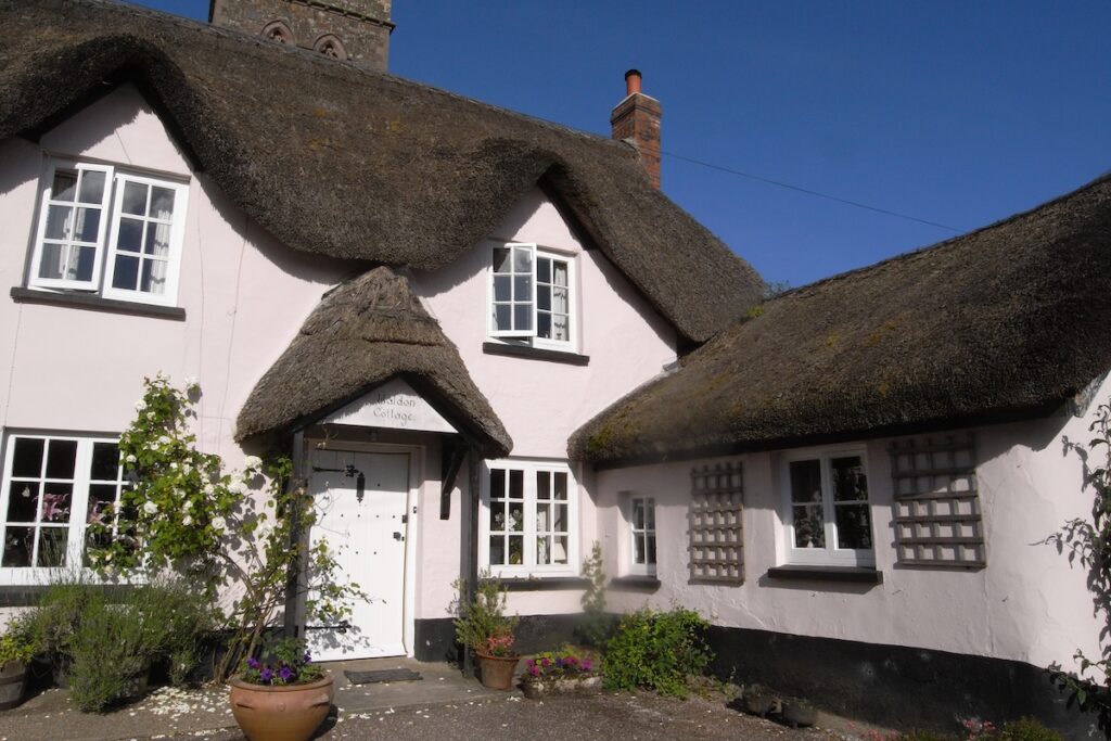 (上)英国の田舎にはまだこのような藁葺き屋根の建物がたくさん残っている。藁で葺いた屋根に刈り込みハサミで模様をつけ、さらに鳥が藁を持って行かないようにネットを被せている家も多い。(下)プーさんの棒投げ橋。橋の川上側から木の枝を流し、川下側で誰の枝が先に流れてくるかと遊んだ橋。