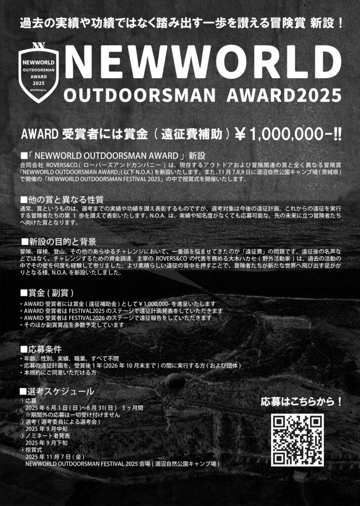 合同会社ROVERS&CO.(ローバーズアンドカンパニー)は、現存するアウトドアおよび冒険関連の賞とはまったくく異なる冒険賞『NEWWORLD OUTDOORSMAN AWARD(以下N.O.A.)』を新設、発表した。