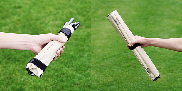 左がチェア、右がテーブルの折りたたみ時。どちらも棒状にまとめられるので、かさばらないし、バッグなどへの収納もしやすいですね