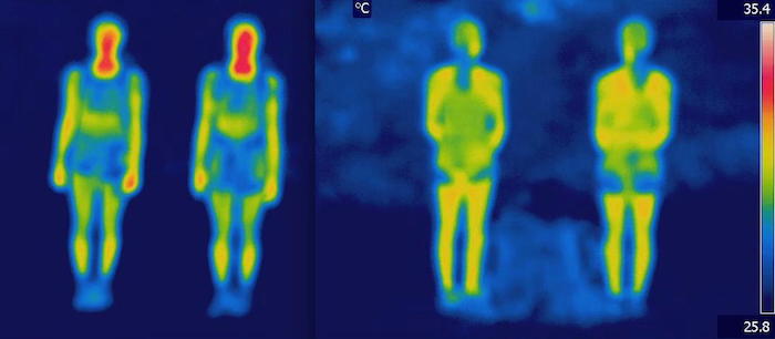今回、使用感の違いを確かめるために用意したのは、コットンのTシャツとサーモグラフィー。出発前に映像を撮ってみると……、正面、背面ともにばっちり同じ体温! さすが双子!