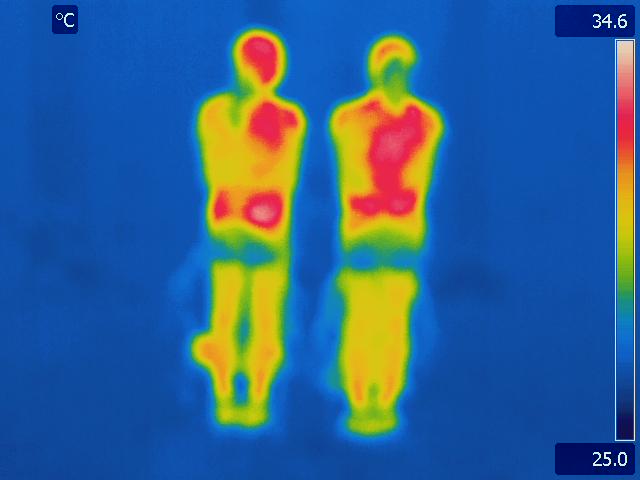 さっそくここでも背中をチェック! パックを下ろしてもらうと背中の汗の差はより顕著に。フィット感の高いパックを背負った結花さんは全面がじっとりと濡れ、対して、夏山用を背負う舞花さんはベルト類が当たる部分を中心に汗が浮いています。サーモグラフィーでもその差はくっきり。パックが背面全体に触れていた結花さんは全体が赤く、舞花さんはパックが接していた部分だけが赤くなり、風が通る部分の温度は低めです。