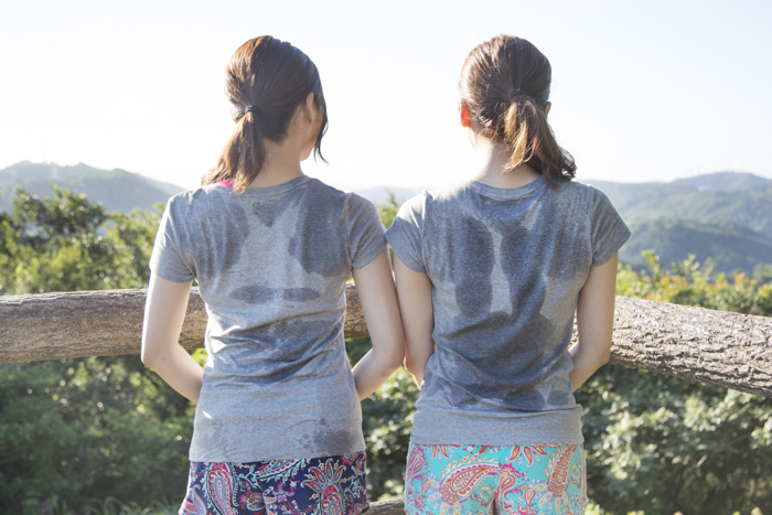ここでもパックを下ろしてもらうと、結花さんの背中はいよいよぐっしょり、汗を吸ってシャツは濃いグレーに。舞花さんの背中も湿ってはきたものの、背中の汗が蒸発しているのか、まだまだ快適そう。