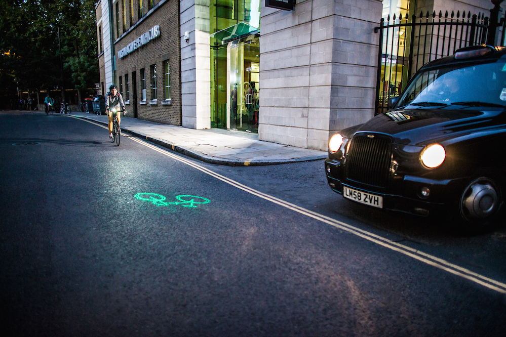 この路面のイラストが周囲に自転車が近づいていることを知らせ、ドライバーは光の海の中から車やバイクではないものが近づくことを知ります。離れたところにいる人の注意は引かず、今までとはまったく別の表現で、自分の存在を知らせて安全を確保できるというわけです。