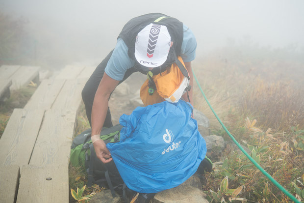 高度をあげていくうちに、ガスはいつの間にか霧雨に。ひょいとパックを木道に下ろした亀田さんが、パックの底部から取り出したのはレインカバー。