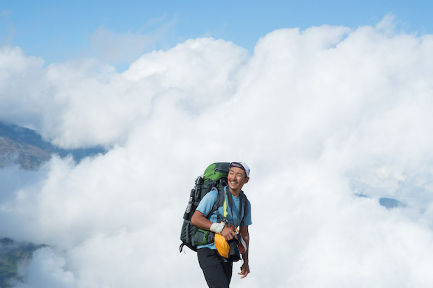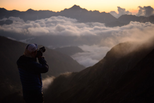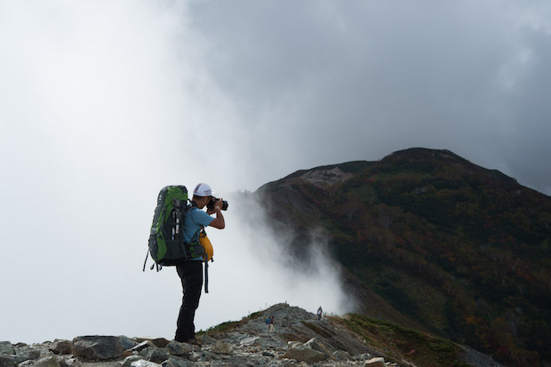 「やっぱりいいな、山は!」と言っていそうな亀田さん。パックを背負ったまま尾根を右に左に動き回り、雲の動きに合わせて撮影していく。