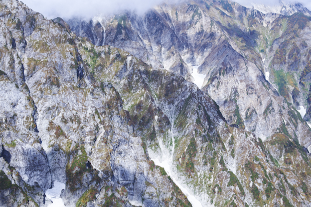 この日のテン場は唐松岳山荘の直下。夕方になってガスが下がると姿を現したのは剱岳と立山。「登っても見ても、いい山だよね」。