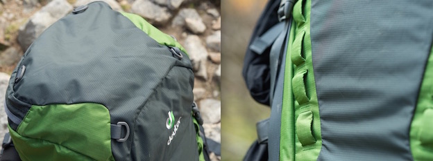 「機材をきちんと装備できることも大切です。パックによっては、三脚は中に収めてしまうのですが、サイドに3本のストラップと、大型のポケットのあるエアコンタクト65+10は三脚をしっかりと保持できます」