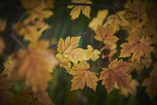 冷え込みの具合で、黄色にも赤にも染まるミネカエデ。亀田正人撮影