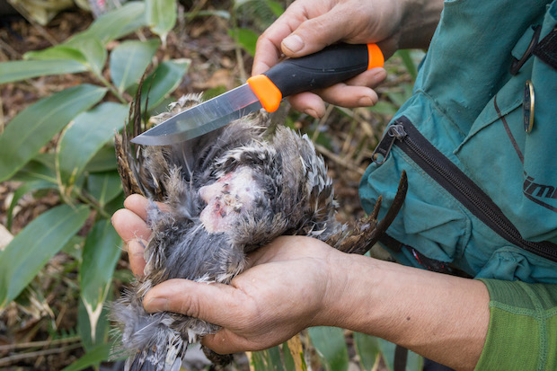 鳥を撃ったときは、肛門から木の枝を突っ込み腸を引き出すように引っ張り出しておくと肉が傷まない。うまく引き出せずに腸が切れてしまった場合や、散弾が腸に入ってしまった場合は、肛門の下あたりを切り開いて腸を出し、洗っておく。