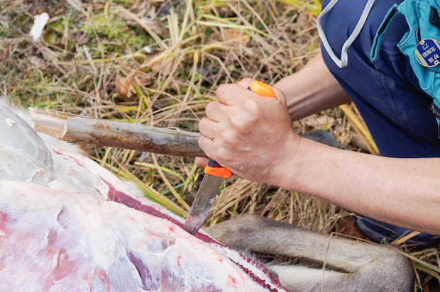 2000は肉への切れ込みを重視した形状で、刃先の曲線がコンパニオンより丸み帯びている。これが思いのほか使いやすい。この牡鹿は、背骨に弾が入り、止め矢としてさらに首を撃った。メスや子鹿なら止め矢は撃たずに止め刺しをするが、大きな牡鹿の場合は角が危険なので、止め矢を撃たせてもらうことが多い。