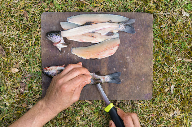 冷たい流れに耐えながら、数尾のニジマスを釣り上げることができた。フィッシングコンフォートスケーラー098の出番である。フィレナイフ形状のナイフで魚をさばくのは初めてだ。聞くところでは、フィレナイフとは不器用なアングロサクソンでも上手に魚をおろせるようにつくられたナイフなので、使いやすいということだ。実際、その通りだった。刃身が厚いことを細くすることで補っており、刃は抵抗なく、ぶれずに魚へ切れ込んでいく。そして苦労なく、きれいに三枚におろすことができた。包丁派としてはちょっと悔しいが、いいナイフだ。ただ、冊から刺身にする過程では、刃の薄い包丁の方にすこし分があるかもしれない。
