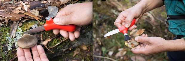 ところでこのキーホルダーのようなキノコ専用ナイフ。何よりも先に目に付くブラシに、北欧のアウトドア仲間たちのキノコに対する真摯な姿勢が垣間見えて微笑ましい。ただ、もっとも洗練された機能は、ブラシではなく、丸く小さいのに握りやすいグリップと、先端が丸い刃の形状だと見た。狭いところにも手を入れやすく、窮屈な姿勢でもキノコを切り落とすのに手首に負担を感じない。美しく切り取られたキノコは必要があればブラシで処理すれば、いっしょに収穫したキノコを汚さず、すぐに料理に使えそうだ。このナイフ、春先の山菜に使ったらどうなのだろう。来年の楽しみが増えたようだ。