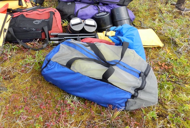 94リットルある大型のメッシュバッグ。カヤック時のキャンプギアをドライバッグに入れたまま、まとめて持ち運ぶのに重宝する。もちろんオートキャンプなどで寝袋やマットなどをまとめて持ち運ぶのにも役に立つ。耐海水も考慮。番手の大きなビスロンジッパーが使われていて、これが開け閉めしやすく滑らかで使いやすい。