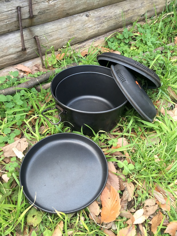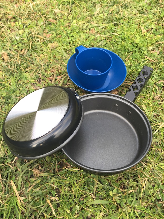 ツアー用に購入した大型の鍋セットは、適度な厚さのアルミ製で内側は2層構造のノンスティック加工。使用後の汚れの拭き取りもラク。5〜6人くらいまでなら対応可能な5リットルと3リットルの鍋。直径20cmほどのフライパンは大きめで調理しやすい。ご飯を炊きたい日本人としては、湯きりの穴はいらないとも思う。蓋は皿代わりにもなる。おもに焚き火の調理で使っているのでハンドルカバーは溶け、フタも一部溶けている。が、問題なく使えて気に入っている。