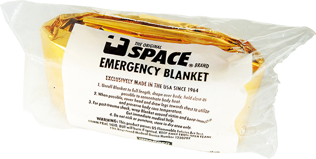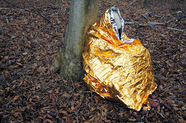 使い方は簡単、広げて体を覆うだけ。表面はゴールドと裏面はシルバーになっている。体からの放射熱を80%反射するというスグレモノ。