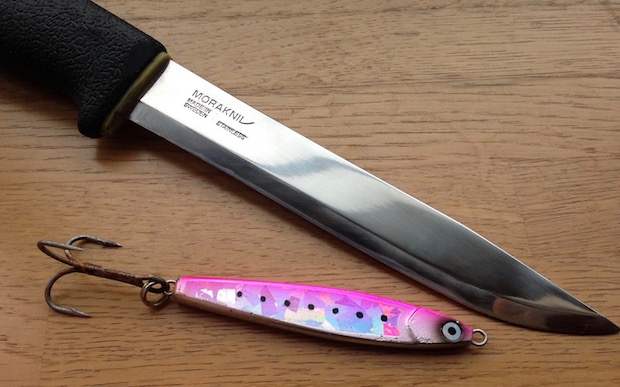 試験に使ったのはモーラナイフの「748MG」とルアーボックスのなかで錆び付いていたジグのフック。研削の具合がわかりやすいよう、ナイフには一度バフをかけました