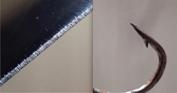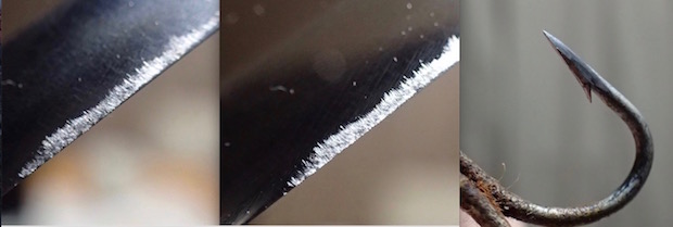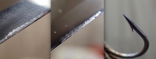 広めのヤスリ面は触ると「ザラリ」とした粒立ちで、刃先をなでればその名に恥じない驚きの研削力でタッチアップ。思わず口をついて出るのはあのフレーズ。「ダイヤモンドだねー!」。削りっぷりは刃の減りが心配になるほどだが、砥粒が大きいので刃先に着く鋸歯は大きめ。釣り鉤を砥ぐには砥粒が粗すぎたため、鉤先カットは割愛。