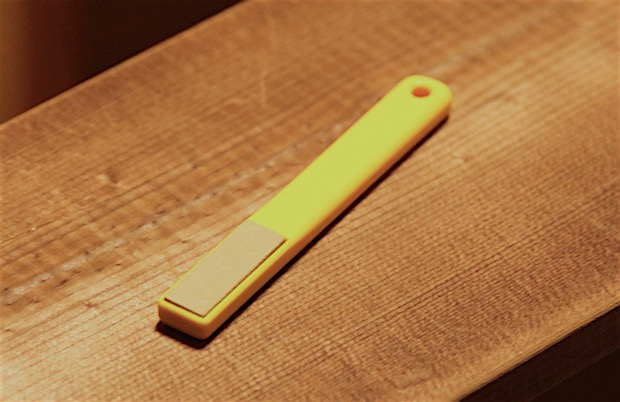 メーカーサイトの紹介文はたったの12文字。「ナイフや鈎研ぎに最適です」。この製品の公に明かされている情報は以上のみ。名前から素材はセラミックと知れるものの、「セラミック」自体が陶磁器からときにはシリコン、炭化物まで指すことを考えると、製品のスペックのほぼすべてが謎に包まれている。ヤスリ面の長さは30㎜、重さ8.5g。